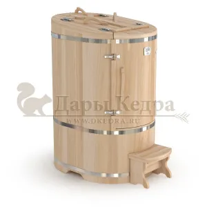Готовый комплект - это полностью укомплектованный набор с фитобочкой для процедур парения. Овальная модель более просторна и удобна в использовании. Толщина стенок составляет 25 мм. Бочка оборудована откидными створками, дверцей и отверстием для головы. Верхний скос изделия делает положение головы более комфортным и улучшает обзор. Во время парения человек сидит внутри кедровой бочки, а голова находится снаружи. Благодаря этому исключается возможность перегрева. Подлокотники из кедра, встроенные ручки на створках и двери делают эксплуатацию более удобной.