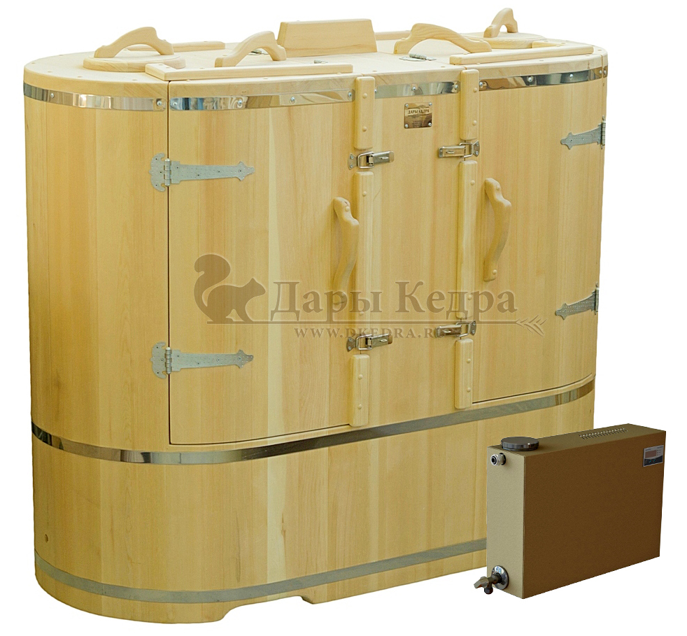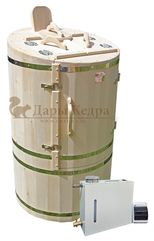 Готовый комплект «Удобный+»: кедровая бочка с парогенератором + био-защита изнутри и снаружи Готовый комплект - это полностью укомплектованный набор с фитобочкой для процедур парения. Овальная модель более просторна и удобна в использовании. Толщина стенок составляет 25 мм. Бочка оборудована откидными створками, дверцей и отверстием для головы. Верхний скос изделия делает положение головы более комфортным и улучшает обзор. Во время парения человек сидит внутри кедровой бочки, а голова находится снаружи. Благодаря этому исключается возможность перегрева. Подлокотники из кедра, встроенные ручки на створках и двери делают эксплуатацию более удобной. Парение в фитобочке благотворно влияет на организм в целом: повышается иммунитет, выводятся шлаки и токсины, улучшается работа органов тела и состояние кожи.