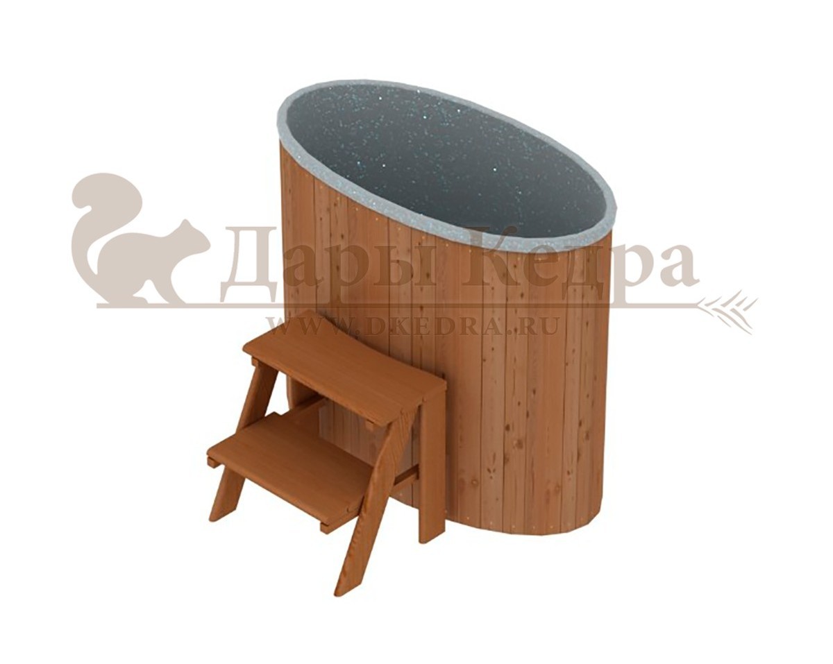 Это купель с внутренней овальной чашей, которая изготовлена из современного прочного и термоустойчивого материала (композита). Форма чаши обеспечивает комфортную посадку внутри изделия. Для удобного использования купель оснащена приставной лестницей. Обручи из нержавеющей стали декорируют купель с композитом и равномерно распределяют нагрузку во время процедур.